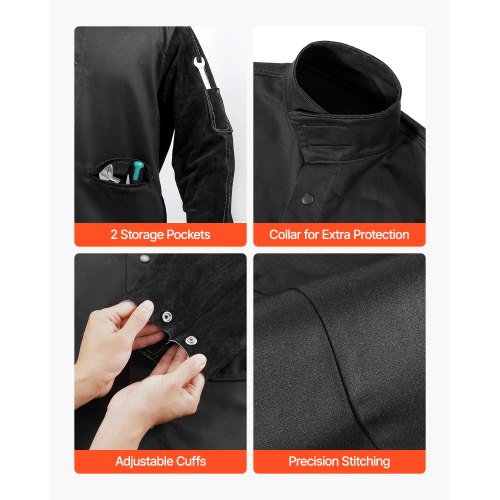 Flame-Resistant Welding Jacket M Size Heavy Duty Cowhide Leather & 9oz FR CottonHigh Protection LevelWarm TipsHigh Quality2 PocketsWide ApplicationsDurable ButtonsChest: 48 in,Sleeve Length: 33 in,Size: M,Color: Black,Material: Cowhide Leather & Cotton,Flame-Resistant Material: Yes,Product Dimensions: 28.0 x 48.0 x 33.0 in / 711.2 x 1219.2 x 838.2 mm,Button Type: Snap Button,Length: 28 in,Item Model Number: AP-2530,Pockets: 2,Net Weight: 2.43 lbs / 1.1 kg,Arc Rating: ATPV 9.2 Cal/cm²