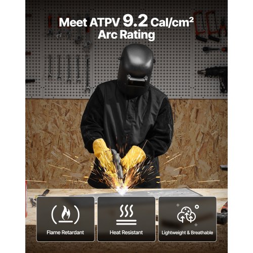 Flame-Resistant Welding Jacket XXL Heavy Duty Cowhide Leather & 9oz FR CottonHigh Protection LevelWarm TipsHigh Quality2 PocketsWide ApplicationsDurable ButtonsChest: 56 in,Sleeve Length: 36 in,Size: XXL,Color: Black,Material: Cowhide Leather & Cotton,Flame-Resistant Material: Yes,Product Dimensions: 31.9 x 56.0 x 36.0 in / 810.1 x 1422.4 x 914.4 mm,Button Type: Snap Button,Length: 31.9 in,Item Model Number: AP-2530,Pockets: 2,Net Weight: 3.07 lbs / 1.39 kg,Arc Rating: ATPV 9.2 Cal/cm²
