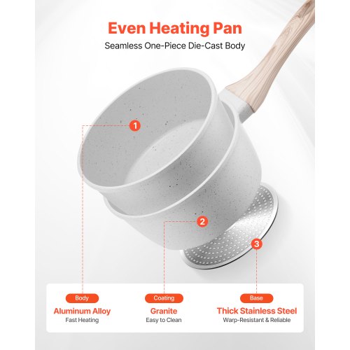 VEVOR 1.5 QT Saucepan Nonstick Saucepan with Glass Lid & Detachable Handle White<br/>Multi-Purpose Saucepan<br/>Versatile Cooking Applications<br/>Nonstick Coating<br/>Easy to Clean<br/>Thoughtful Design Details<br/>Space-Saving Hanging Design<br/>Product Dimensions (Interior): 1.5 QT (6.3 in / 16 cm),Main Materials: Aluminum Alloy,Handle Structure: Detachable – Screw-Lock,Lid Material: Tempered Glass, Thickness: 0.14 in / 3.5 mm,Body Color: Cream White,Item Model Number: S-LY-02,Coating: Cream White Maifan Stone,Product Dimensions: 13 x 6.7 x 5.1 in / 330 x 170 x 130 mm,Net Weight: 1.43 lbs / 0.65 kg,Handle Material: Bakelite Handle