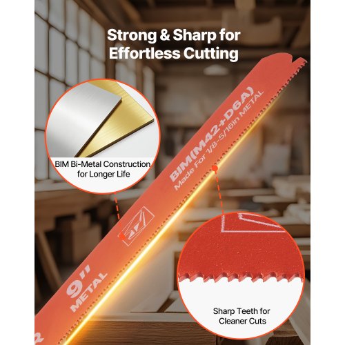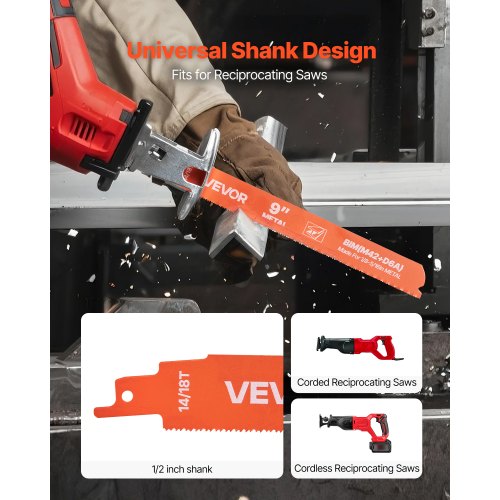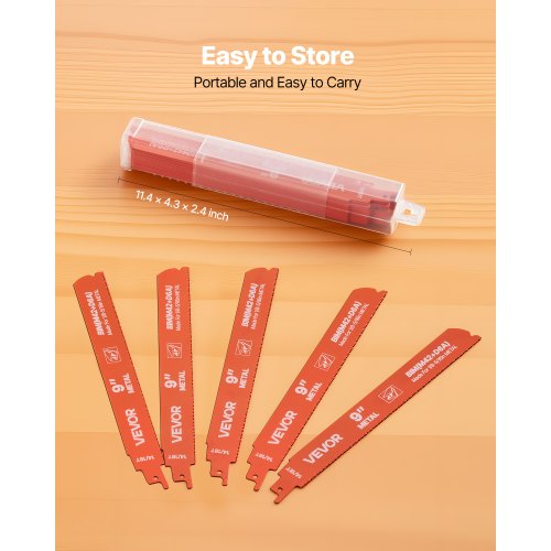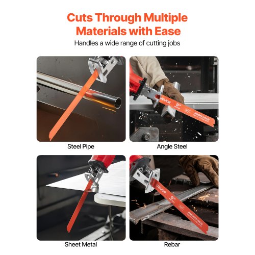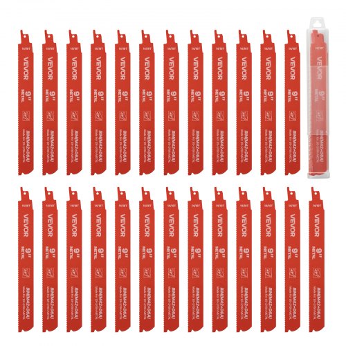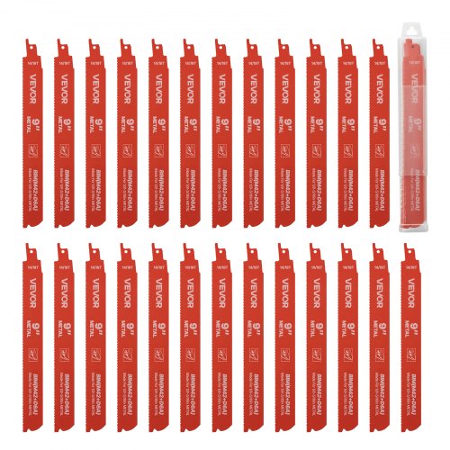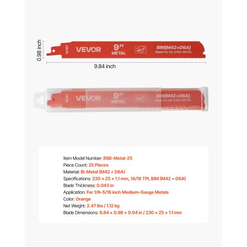 VEVOR Reciprocating Saw Blades 25 Pack 14/18 TPI Bi-Metal for Cutting Metals<br/>High-Quality Blades<br/>Versatile Use<br/>Hardened Material<br/>Wide Compatibility<br/>Portable & Dust-Resistant<br/>Protective Coating<br/>Blade Dimensions: 9.84 x 0.98 x 0.04 in / 230 x 25 x 1.1 mm,Specifications: 230 x 25 x 1.1 mm, 14/18 TPI, BIM (M42 + D6A),Blade Thickness: 0.043 in,Color: Orange,Item Model Number: RSB-Metal-25,Material: Bi-Metal (M42 + D6A),Piece Count: 25 Pieces,Application: For 1/8–5/16 inch Medium-Gauge Metals,Net Weight: 2.47 lbs / 1.12 kg