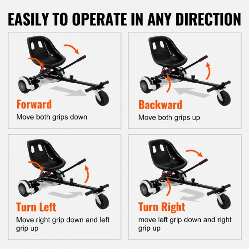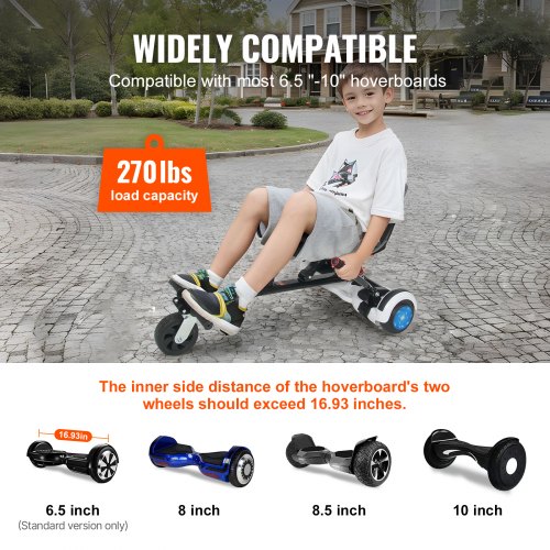 VEVOR Hoverboard Seat Attachment, for 6.5" 8" 8.5" 10" Hoverboards, Dual Shock Absorption System, Grips Control, Adjustable Length 270 LBS load Capacity, Hover Board Buggy Attachment, for Kids AdultsDual Shock AbsorptionAdaptable to Different SurfacesWide compatibilityStable ManeuverabilitySmooth and ComfortableEasy InstallationItem Model Number: BH-003,Max Load Capacity: 270 lbs/125 kg,Shortest: 38.6 x 22 x 17.3 inch/980 x 560 x 440 mm,Net Weight: 15.47 lbs/7.02 kg,Product Size: 41.3 x 22 x 17.3 inch/1050 x 560 x 440 mm