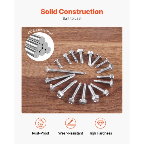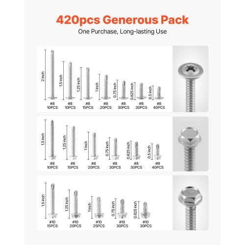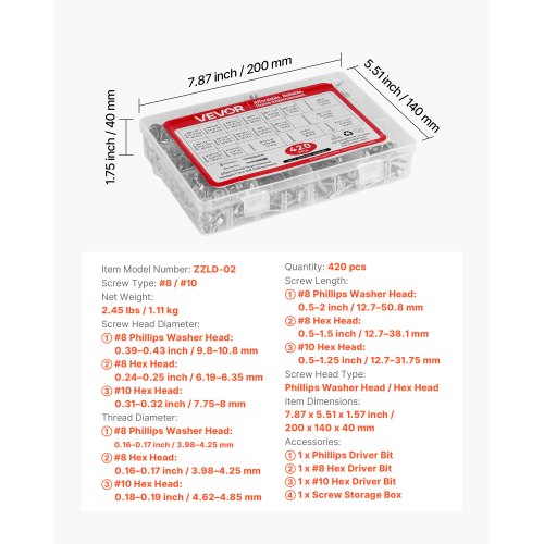 420 Pc Self Drilling Screw Assortment Set #8 #10 Hex/Phillips Head 1/2 to 2 Inch<br/>Multi-Size Self-Drilling Screw Set<br/>High Hardness, Easy Penetration<br/>Wide Application<br/>Drilling & Fastening in One Step<br/>Complete Specifications<br/>Green and Reliable<br/>Thread Diameter:,Screw Length:,① #8 Phillips Washer Head: 0.5–2 inch / 12.7–50.8 mm,Item Model Number: ZZLD-02,③ #10 Hex Head: 0.5–1.25 inch / 12.7–31.75 mm,Screw Head Type: Phillips Washer Head / Hex Head,Quantity: 420 pcs,Item Dimensions: 7.87 x 5.51 x 1.57 inch / 200 x 140 x 40 mm,Screw Type: #8 / #10,Screw Head Diameter:,② #8 Hex Head: 0.5–1.5 inch / 12.7–38.1 mm,Net Weight: 2.45 lbs / 1.11 kg