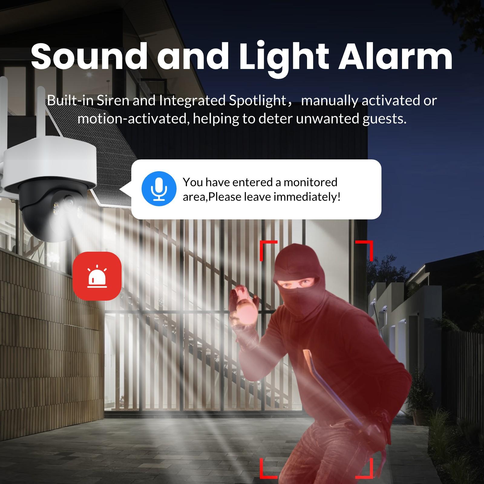 Built-in Siren and Integrated Spotlight, manually activated or motion-activated, helping to deter unwanted guests;