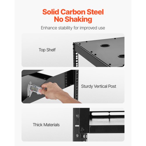 VEVOR 12U Open Frame Network Rack Wall Mounted Server Rack 4 Post with Shelves<br/>Solid Carbon Steel<br/>Open Frame Design<br/>23 in/585 mm Depth<br/>Ergonomic Design<br/>Versatile Applications<br/>Clear Scale<br/>Item Model Number: SPT-504-12A,Standard Mounting Width: 19 in/482 mm,Wall-Mounted Load Capacity: 200 lbs/90.7 kg,Height: 12U,Floor-Mounted Load Capacity: 500 lbs/226.8 kg,Material: Q235,Depth: 23 in/585 mm