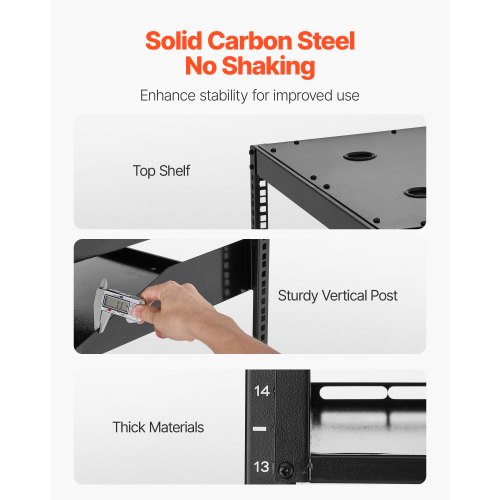 VEVOR 16U Open Frame Network Rack Wall Mounted Server Rack 4 Post with Shelves<br/>Solid Carbon Steel<br/>Open Frame Design<br/>23 in/585 mm Depth<br/>Ergonomic Design<br/>Versatile Applications<br/>Clear Scale<br/>Item Model Number: SPT-504-16A,Standard Mounting Width: 19 in/482 mm,Wall-Mounted Load Capacity: 200 lbs/90.7 kg,Height: 16U,Floor-Mounted Load Capacity: 500 lbs/226.8 kg,Material: Q235,Depth: 23 in/585 mm