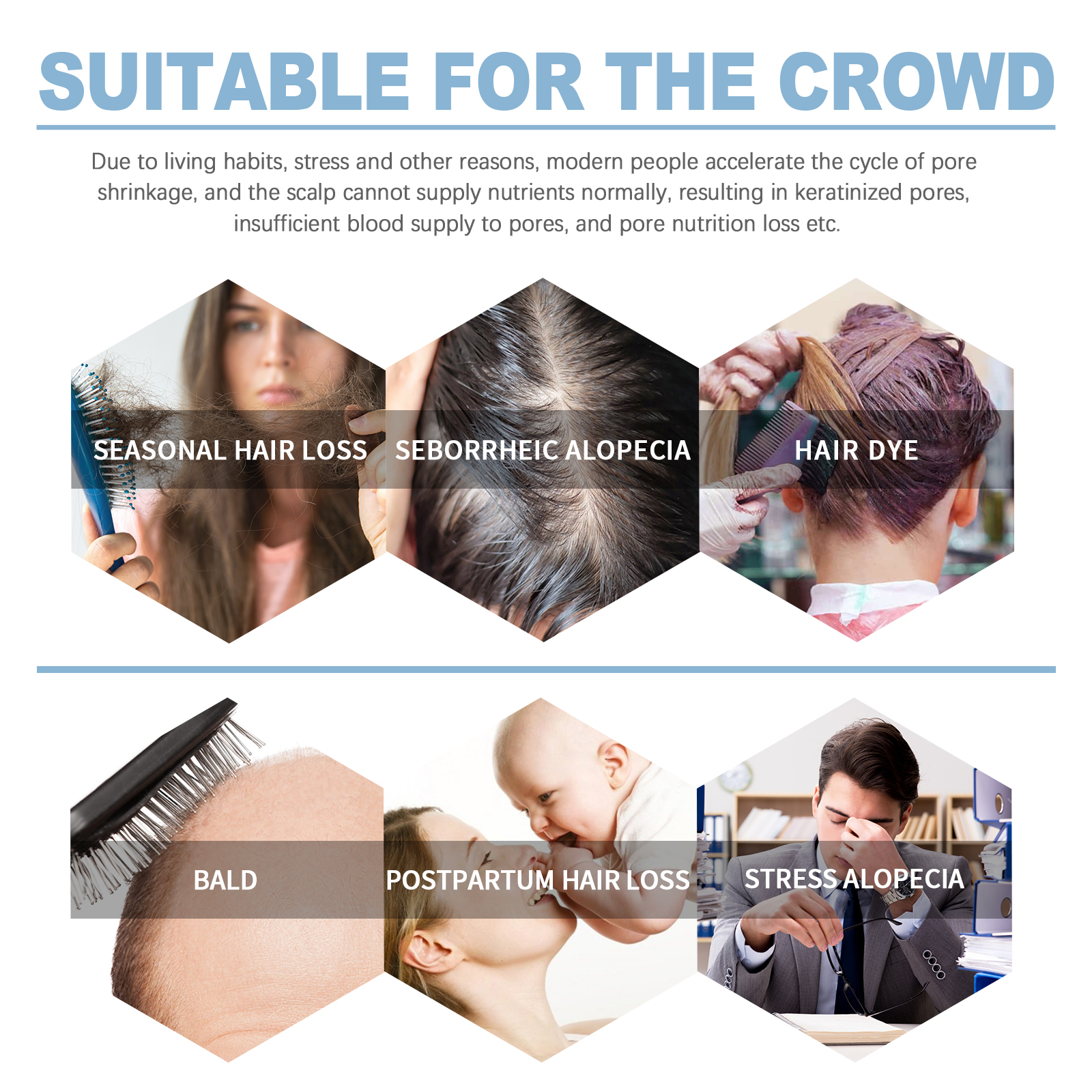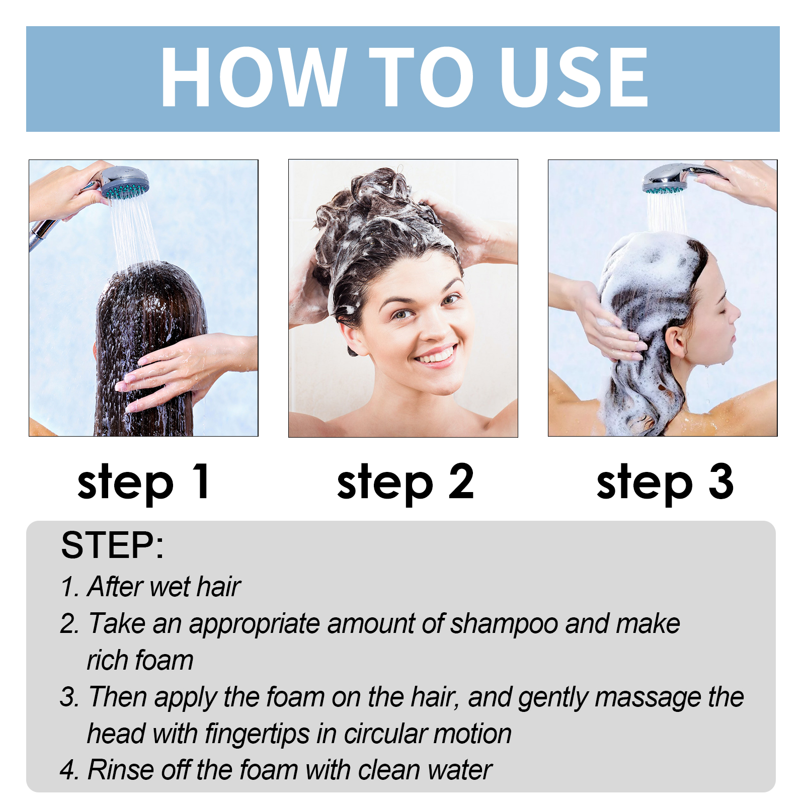 Our dense foam shampoo contains rosemary oil, Polygonum multiflorum extract and Platycladus orientalis leaf extract. It can reduce hair loss, stimulate hair growth, restore the vitality of hair, and make hair thicker and fuller. Its usage method is very simple: 1. After wetting your hair, 2. Take an appropriate amount of shampoo and make it into a thick foam, 3. Then apply the foam to your hair and gently massage your head in circular motions with your fingertips. 4. Rinse off the foam with clean water. And it can also solve problems such as keratinized pores, insufficient blood supply to pores, and loss of nutrients in pores.