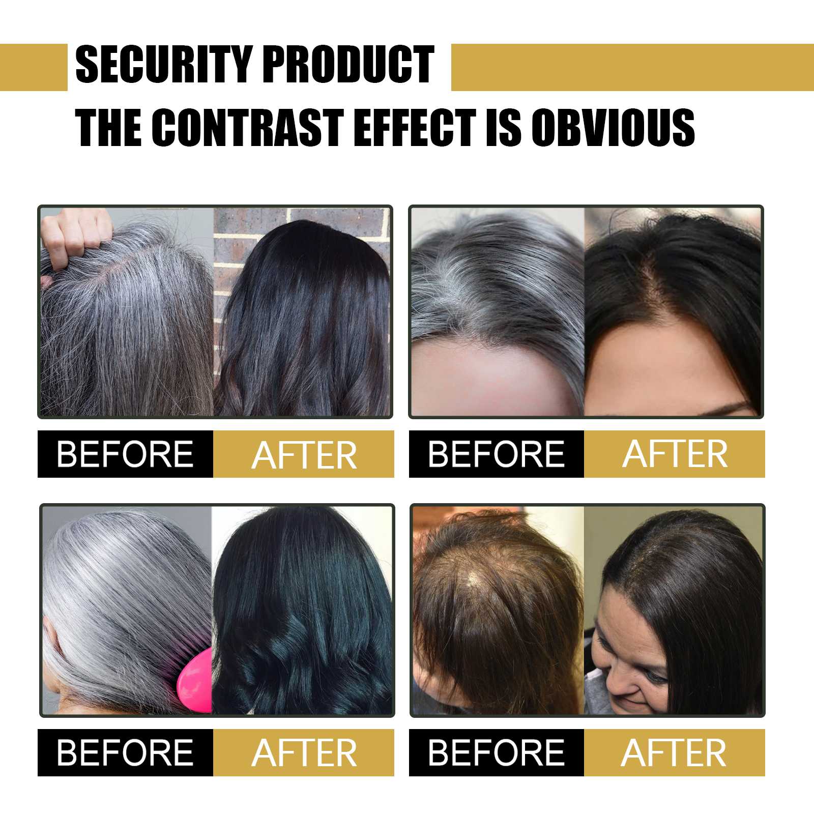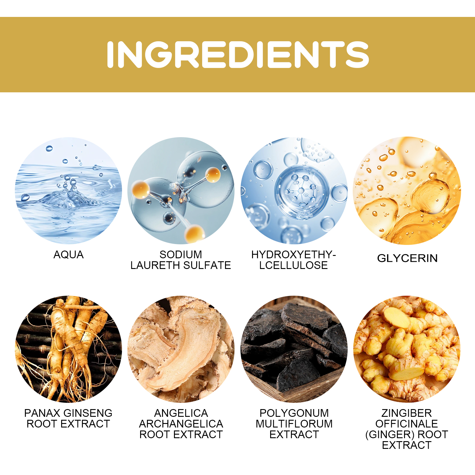 Our White to Black shampoo contains Roundabout leaf root extract, Polygonum multiflorum extract and ginger root extract. It can help you gradually restore hair color, help you improve self-confidence, effectively regulate the production of melanin, coordinate hormone levels, help improve scalp health, stimulate hair vitality. Its use method is very simple: first wet the hair with warm water, take an appropriate amount of this product in the palm, rub into a foam, then apply to the hair, gently massage the hair and scalp with the fingertips, and finally rinse the hair and scalp with warm water until all the foam is washed away. It can gradually restore hair color, regulate melanin production and coordinate hormone levels to improve scalp health.