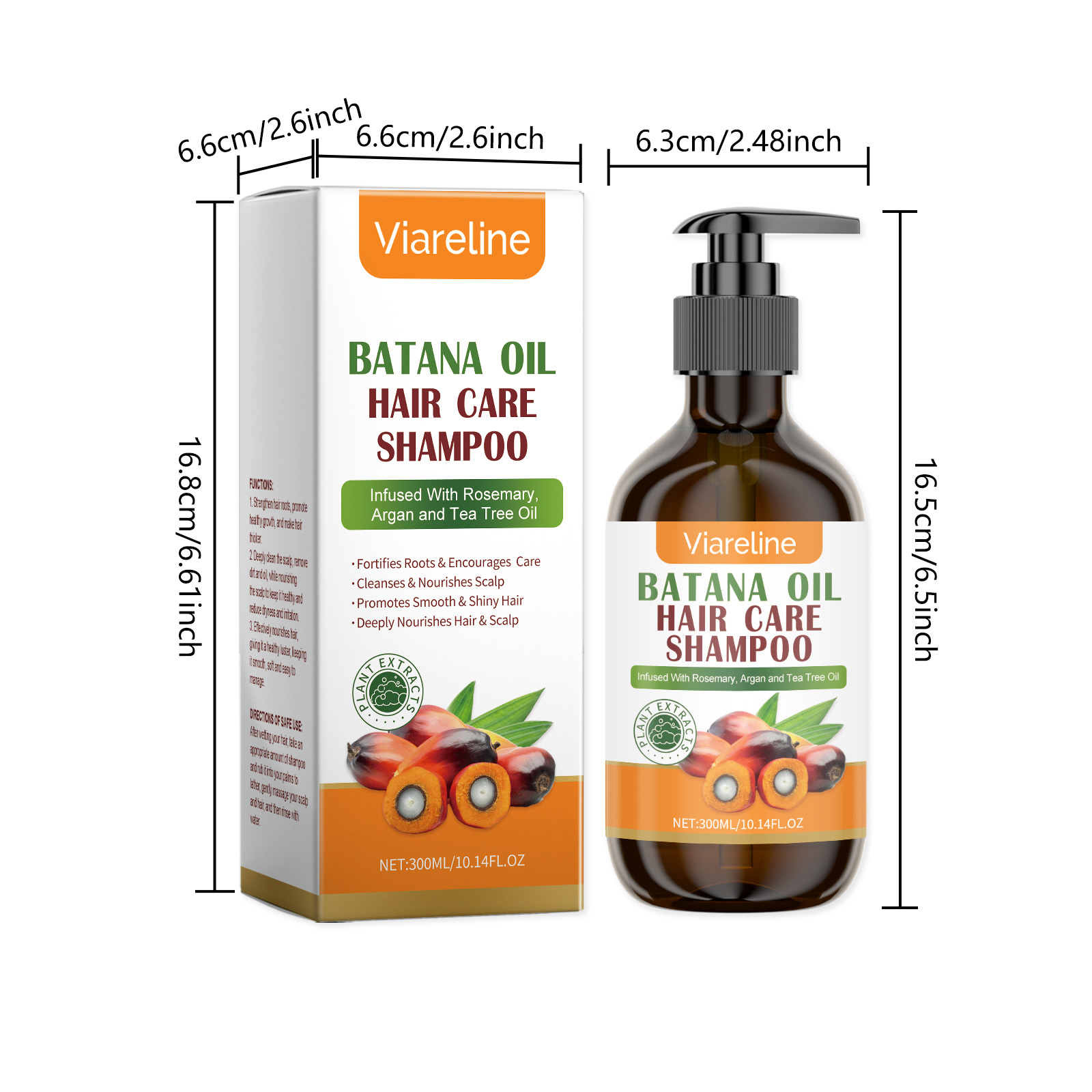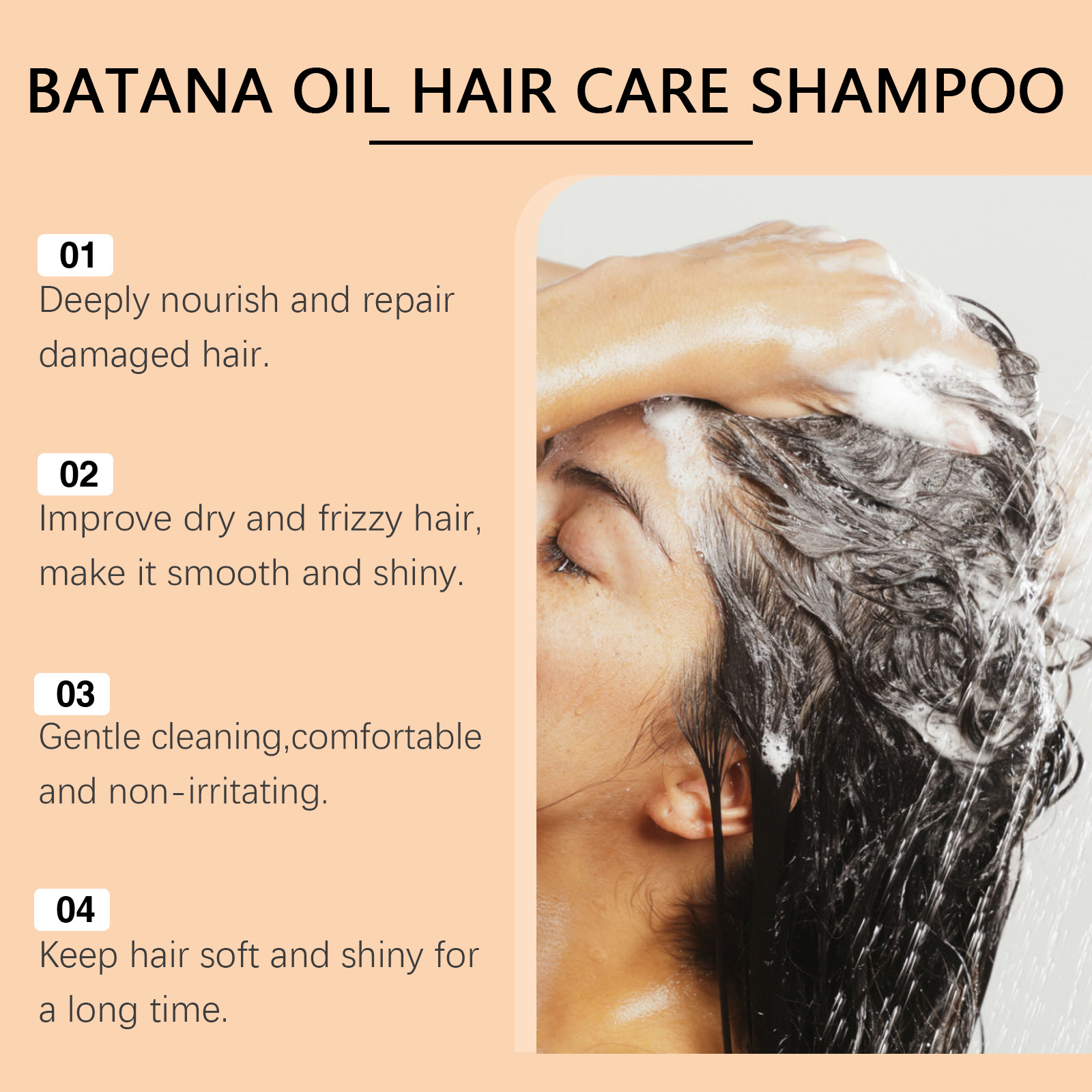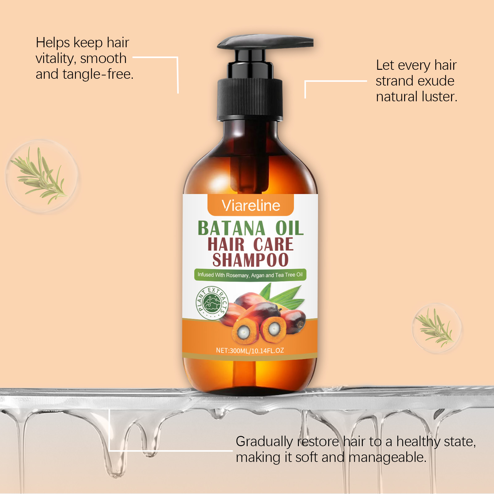 Our Batana oil shampoo contains sodium laureth sulfate and hydroxyethyl cellulose. It can make hair softer and say goodbye to dryness. Complete care to restore natural shine. Its use method is very simple: after wetting the hair, take an appropriate amount of shampoo and rub it into the palm of the hand to foam, gently massage the scalp and hair, and then rinse with water. And keep your hair smooth and natural.