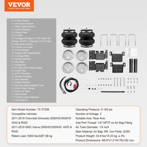 VEVOR Airbag Suspension Kit 11-2019 Chevrolet Silverado GMC Sierra 2500/3500 HDVEVOR Air Bag Suspension KitRelieve Leaf SpringsDurable and Leak-ProofSmooth and Safe DrivingNo Drilling RequiredIncluded Cable TiesOperating Pressure: 5-100 psi,Suitable Axle: Rear Axle,Item Model Number: 7X 57538,Number of Airbags: 2,Product Weight: 33.8 lbs/15.33 kg, ± 3%,Compatible Vehicles: 2011-2019 Chevrolet Silverado 2500HD/3500HD 4WD&RWD, 2011-2019 GMC Sierra 2500HD/3500HD 4WD&RWD,Air Tube Diameter: 1/4 inch,Product Dimensions: Φ6.9"x7.2"/Φ176x182 mm,Inlet Port Thread: 1/8" NPTF on Air Bag Fitting,Main Material: Air Bag: NR, Iron Parts: Q355,Rated Load: 5000 lbs/2267.96 kg