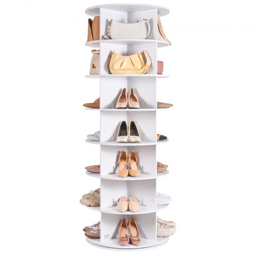 VEVOR 7 Tiers Rotating Shoe Rack Tower, 360°Spinning Shoe Display, Revolving Shoe Rack Storage Round Carousel, Lazy Susan Shoe Rack Organizer, Ideal for Bedroom, Living Room, Entryway, WhiteNeat & OrganizedMulti-Functional UseSturdy & DurableSpace-Saving DesignQuick & Easy InstallationSafe & Secure ShippingTiers: 7 Layers, 4 Columns,Color: White,Item Model Number: OY-XZXJ-01,Product Weight: 46.5 lbs / 21.1 kg,Shoe Capacity: 28 Pairs,Material: PVC Wood-Plastic Board,Shelf Height: 8.3 in / 21 cm,Product Dimensions: 23.6 x 23.6 x 64 in / 600 x 600 x 1620 mm,Single Shelf Load Capacity: 35 lbs / 15.9 kg