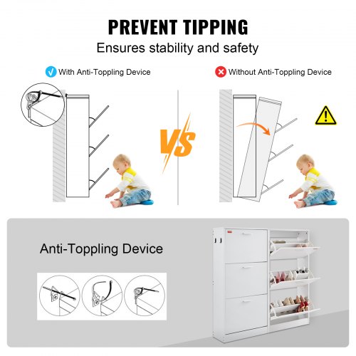 VEVOR Shoe Cabinet with 3 Flip Drawers, Shoe Storage Cabinet for Entryway, Free Standing Shoe Storage Organizer with Side Hooks for Heels, Boots, Slippers in Hallway, Living RoomExquisite Space-Saving SolutionVersatile UsagesSpacious Storage SpaceHigh-Quality and DurableSimple and VersatileAnti-TippingType: 3 Flip-Open Drawers,Load Capacity: ≥100 lbs,Materials: P2 Chipboard,Item Model Number: HZS003,Product Weight: 43.54 lbs/19.75 kg,Drawer Height: 14.25 in/36.17 cm,Handle Material: Aluminum Alloy,Product Size: 23.62 x 9.33 x 47.24 inch/600 x 237 x 1200 mm