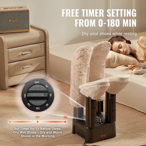 VEVOR Detachable 4 Tubes Shoe Dryer with Heat Blower & Timer Black & Orange,Ultra Silent, Quick Drying for Work Boots, Ski Boots, Sneakers, Gloves, Hats, Helmets4-Tube Shoe DryerEven Quick HeatingFlame-Retardant Materials180-Minute Adjustable TimerVersatile UseEasy Assembly and OperationPower Cord Length: 1.5 m,Function: Multi-function Drying,Temperature Control: 40°C - 50°C (104°F - 122°F),Length: Adjustable,Color: Black + Orange,Item Model Number: SD-008B,Material: PP + ABS,Product Dimensions: 8.9 × 8.9 × 22.6 inches (225 × 225 × 575 mm),Net Weight: 3.7 lbs / 1.7 kg,Power: 200W,Timer Function: 3 H