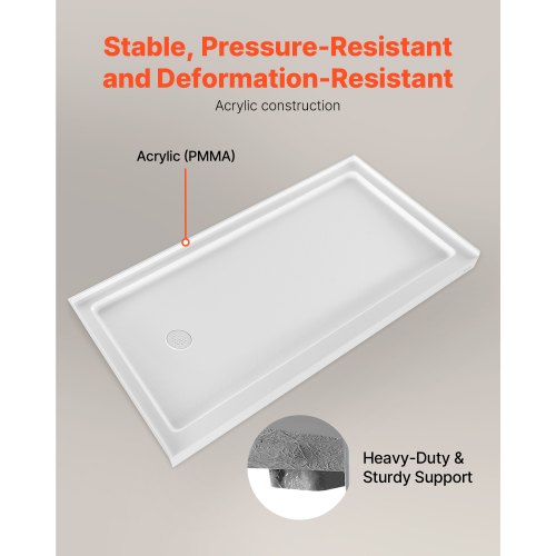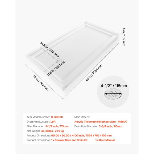 VEVOR Shower Pan 60″ L x 30″ W Single Threshold Shower Base Left Drain<br/>Durable & Slip-Resistant<br/>No More Water Spills<br/>Triple Reinforced Stability<br/>Versatile White Design<br/>Easy Installation<br/>Accessible & Adaptable<br/>Drain Hole Location: Left,Drain Hole Diameter: 3-3/8 inch / 85mm,Item Model Number: D-3003C,Filter Diameter: 4-1/2 inch / 115mm,Product Dimensions: 60.00 x 30.00 x 4.00 inch / 1524 x 762 x 102 mm,Net Weight: 48.28 lbs / 21.9 kg,Main Material: Acrylic (Polymethyl Methacrylate - PMMA)