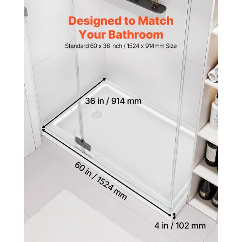 VEVOR Shower Pan 60″ L x 36″ W Single Threshold Shower Base Left Drain<br/>Durable & Slip-Resistant<br/>No More Water Spills<br/>Triple Reinforced Stability<br/>Versatile White Design<br/>Easy Installation<br/>Accessible & Adaptable<br/>Drain Hole Location: Left,Drain Hole Diameter: 3-3/8 inch / 85mm,Item Model Number: D-3003C,Filter Diameter: 4-1/2 inch / 115mm,Product Dimensions: 60.00 x 36.00 x 4.00 inch / 1524 x 914 x 102 mm,Net Weight: 62.83 lbs / 28.5 kg,Main Material: Acrylic (Polymethyl Methacrylate - PMMA)
