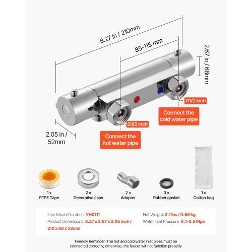 VEVOR Thermostatic Shower Faucet Valve with Secure Lock Leak-Proof Chrome Plated<br/>Comfortable & Secure Showers<br/>Customizable Water Temperature Control<br/>Easily Adjust Water Flow<br/>Durable Brass Build<br/>Simple Installation<br/>Versatile Bathroom Compatibility<br/>Outlet Temperature Range: 68-122℉ / 20-50℃,Color: Chrome Silver,Hole Spacing: 3.35-4.53 inch / 85-115 mm,Inlet Thread: NPT1/2 inch,Outlet Thread: G1/2 inch,Product Dimensions: 8.3 x 2.7 x 2.0 inch / 210 x 68 x 52 mm,Hot Inlet Temperature: 131-185℉ / 55-85℃,Cold Inlet Temperature: 46-84℉ / 7.78-28.89℃,Item Model Number: YH0111,Surface Finish: Chrome Plated,Water Inlet Pressure: 0.1-0.5 Mpa,Net Weight: 2.1 lbs / 0.96 kg ,Main Material: Brass (Grade A)