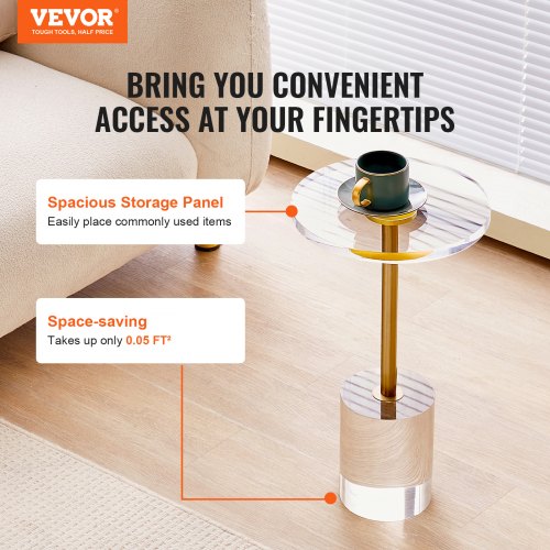 VEVOR Clear Acrylic End Table, Acrylic Side Table with a Solid Base, 11.9 x 11.9 inch Round Tabletop, 21.4 inch High, for Coffee, Drink, Food, Snack used in Living Room, Bedroom, and StudyOptimal HeightOutstanding Acrylic MaterialSturdy StructureEasy to CleanWide ApplicationSmooth Table EdgeTray Size: φ11.9x0.8 in/φ302x20 mm,Loading Weight: ≤22lbs/10 kg,Item Model Number: JYFT-002R,Product Weight: 13.7 lbs/6.2 kg,Main Material: Acrylic,Product Size: φ11.9x21.4 in/φ302x543 mm