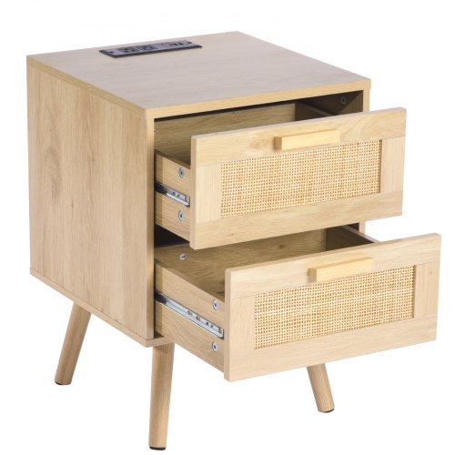 Vevor Rattan Nightstand End Table, Side Table with 2 Hand Made Rattan Decorated Drawers, Wood Accent Table with Storage for Bedroom, NaturalNatural Rattan DesignClassified StorageBuilt-In Power StripSturdy and DurableVersatile UseEasy AssemblyPower Strip Output: AC 110~120V, 60Hz, Maximum Power 1500W,Item Model Number: SR191628-US--1PC,Product Weight: 22.05 lbs / 10 kg,Power Strip Configuration: 2 AC Outlets + 2 USB Ports + 1 Type-C Port,Drawer Dimensions: 12.99 x 10.63 x 3.54 inches / 330 x 270 x 90 mm,Product Dimensions: 15.55 x 16.54 x 21.65 inches / 395 x 420 x 550 mm (including handle)