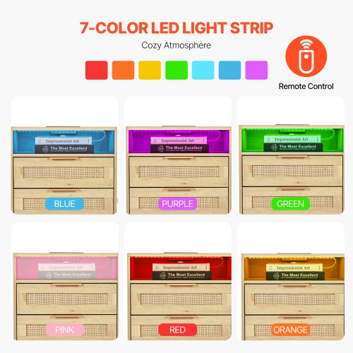 VEVOR Rattan Nightstand, Boho Bedside Table with Drawer Open Shelf, Rattan End Table Wooden Nightstand with Solid Wood Legs, Rattan Side Table with Charging Station, for Bedroom, Study & Living RoomNatural Rattan DesignClassified StorageBuilt-In Power StripSturdy and DurableVersatile UseEasy AssemblyLight Strip: 25 Modes + 7 Colors + 6 Brightness Levels + 6 Speeds,Weight Capacity: 100 lbs,Power Strip Output: AC 110~120V, 60Hz, Maximum Power 1500W,Item Model Number: SR248011-US--1PC,Product Weight: 24.25 lbs / 11 kg,Power Strip Configuration: 2 AC Outlets + 2 USB Ports + 1 Type-C Port,Drawer Dimensions: 15.35 x 10.63 x 3.15 inches / 390 x 270 x 80 mm,Product Dimensions: 17.80 x 14.25 x 23.23 inches / 452 x 362 x 590 mm (including handle)