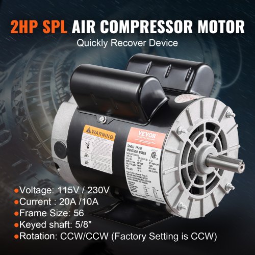 2HP SPL Air Compressor Motor 115/230V 20/10A 3450RPM 56 Frame CW/CCW Rotation (Factory Setting is CCW)Powerful MotorCW/CCW Rotation DirectionEfficient CoolingSafety CertificationHigh-quality FrameSafety ProtectionShaft Length: 1.88",SF: 1.0,Voltage: 115V / 230V,Item Model Number: DP120256SL,Frequency: 60HZ,Shaft Diameter: 5/8" Keyed Shaft,Enclosure: ODP,Current: 20 A / 10 A,Net Weight: 25.2 lbs / 11.45 kg,Keyway Size: 0.188",Frame Size: 56