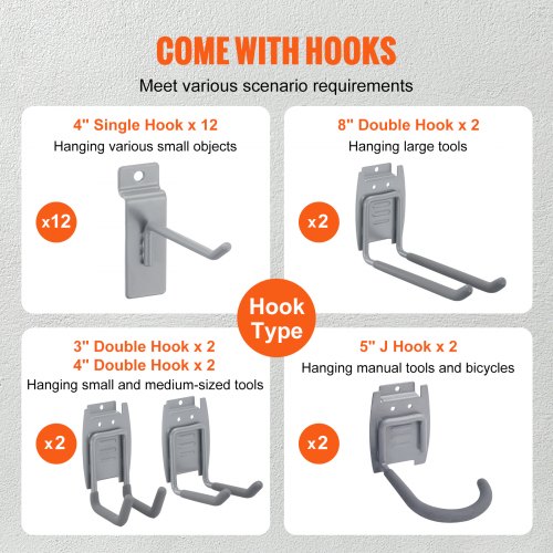 VEVOR Slatwall Panels with Hooks, 4 ft x 1 ft Gray Garage Wall Panels 12"H x 48"L (Set of 8 Panels), Heavy Duty Garage Wall Organizer Display for Retail Store, Garage Wall, Craft Storage OrganizationSturdy, Stylish, Slatwall SavvyUniversal Groove DesignDetail-Rich DesignSimple and Quick InstallationA Panel for Every PlaceModular MagicType: PVC Slatwall Panel,Main Material Thickness: 0.26 in/6.6 mm,Load Capacity: 75 lbs/34 kg,Number of Panels: 8,Color: Gray,Groove Width: 0.41 in/10.4 mm (Narrow End); 0.72 in/18.4 mm (Wide End),Item Model Number: WSWP-8H,Product Weight: 49.60 lbs/22.5 kg,Material: WPC,Each Panel Size: 48.03 x 12.20 x 0.67 in/1220 x 310 x 17 mm,Total Area: 32 sq.ft/2.97 ㎡