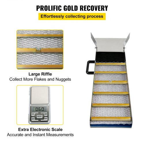 VEVOR Aluminum Alloy Sluice Box, Compact 36" Mini Sluice Boxes for Gold, Lightweight Gold Sluice Equipment, Portable Sluice Boxes w/Miner's Moss, River, Creek, Gold Panning, Prospecting, DredgingCompact DesignLabor-Saving ToolAluminum Alloy ConstructionConvenient AssemblyHumanized DesignExtra Electronic ScaleThickness: 0.059 in / 1.5mm,Length: 36 in / 915 mm,Flared Opening: 13.7 in / 348.8 mm,Model: VV-JH-TJC36,Material: Aluminum Alloy,Height: 2.6 in / 65 mm,Width: 9 in / 230 mm,Weight: 7.5 lbs / 3.4 kg