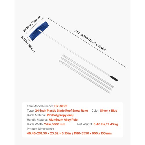 VEVOR 3.8-18.2 ft Snow Roof Rake 24 in Plastic Blade with Wheels Lightweight<br/>Efficient Snow Removal<br/>Premium Material<br/>Easy Operation<br/>Convenient Storage<br/>Versatile Application<br/>Complete Accessories<br/>Blade Material: PP (Polypropylene),Type: 24-inch Plastic Blade Roof Snow Rake,Color: Silver + Blue,Item Model Number: CY-SF22,Product Dimensions: 46.46-218.50 x 23.62 x 6.10 in/1180-5550 x 600 x 155 mm,Net Weight: 5.40 lbs/2.45 kg,Handle Material: Aluminum Alloy Pole,Blade Width: 24 in/600 mm