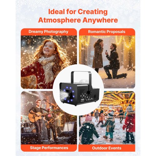 VEVOR Handheld Hanging Snow Machine with Lights 1500W Remote & DMX512 Control<br/>Multi-Functional Snow Machine<br/>Large Capacity for Extended Use<br/>Reliable Safety Features<br/>User-Friendly Design<br/>Ideal for Various Occasions<br/>A Meaningful Christmas Present<br/>Spray Distance: 16.40 ft/5 m,Remote Control: Included,Color: Black,Input Voltage: AC 110V–120V, 60Hz,Mounting Method: Hanging or flat placement,Product Dimensions: 18.50 x 14.17 x 16.54 in/470 x 360 x 420 mm,Oscillation Function: Not Included,Adjustment Settings: Not Applicable,Ambient Lighting: Included,Fluid Tank Capacity: 5L,Main Materials: Cold-rolled Steel (SPCC) + Plastic (PP),Item Model Number: LM-LED-1500,Rated Power: 1500W (nominal),Wired Control: Not Included,Coverage Area: 25 m²,Net Weight: 16.47 lbs/7.47 kg