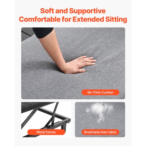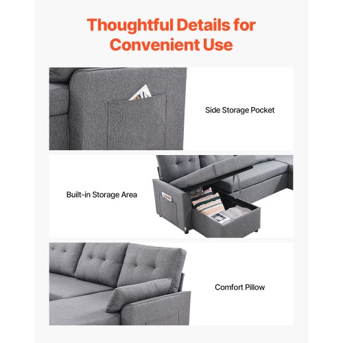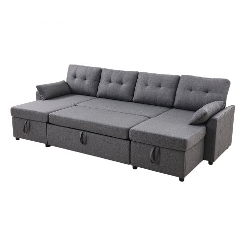 VEVOR U Shaped Sofa Bed, Convertible Sofa Bed with 2 Side Pockets, 2 Pillows and Double Chaise, 6-Seat Pull Out Sleeper Couch with Large Storage Capacity for Living Room, Apartment, Metal Frame, GrayMulti-functional SofaFlexible RecliningStorage SeatsPremium MaterialsEasy to Assemble and UseStylish and VersatileArmrest Width: 5.9 in / 15 cm,Weight Capacity: 1600 lbs / 726 kg,Sofa Cushion Thickness: 6 in / 15.2 cm,Color: Gray,Product Dimensions (Right-Angle): 113 × 57.1 × 35.8 in / 287 × 145 × 91 cm,Item Model Number: LW-0667-2T-11R-11L,Seat Height: 18.9 in / 48 cm,Material: Linen; Foam; Metal Frame; Laminated Board,Sofa Seat Width (Single Seat): 25 in / 63.5 cm,Net Weight: 256.6 lbs / 116.4 kg,Armrest Height: 23.2 in / 59 cm