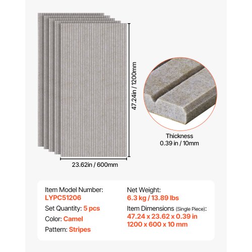 5 Pack Acoustic Wall Panels 47.2 x 23.6 x 0.4 inch Self-Adhesive CamelSilent SpaceMultifunctional UsesSecure MaterialsEasy & Quick InstallationMultiple Color OptionsAesthetic & PracticalPattern: Stripes,Set Quantity: 5 pcs,Color: Camel,Item Model Number: LYPB51206,Material Grade: E0,Item Dimensions (Single Piece): 1200 x 600 x 10 mm / 47.24 x 23.62 x 0.39 inches,Net Weight: 6.3 kg / 13.89 lbs,NRC: 0.85,Main Material: Polyester Fiber,Back Adhesive: 3M, Self-adhesive