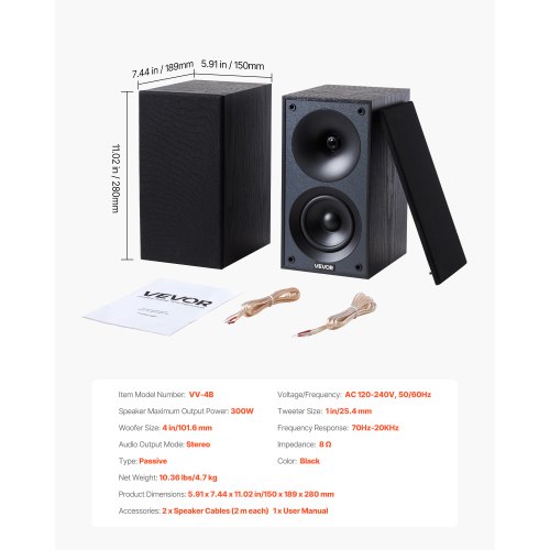 Passive Bookshelf Home Speakers Pair of Stereo Audio Speakers Cone 70Hz-20KHz4-Inch Passive Bookshelf Speaker300W Room-Filling SoundEfficient TransmissionPremium MDF Wooden EnclosureStylish for Any SpaceComplete AccessoriesTweeter Size: 1 in/25.4 mm,Voltage/Frequency: AC 120-240V, 50/60Hz,Audio Output Mode: Stereo,Type: Passive,Color: Black,Item Model Number: VV-4B,Woofer Size: 4 in/101.6 mm,Frequency Response: 70Hz-20KHz,Impedance: 8 Ω,Product Dimensions: 5.91 x 7.44 x 11.02 in/150 x 189 x 280 mm,Net Weight: 10.36 lbs/4.7 kg,Power Output: 300W