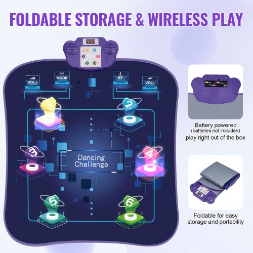VEVOR Dance Mat for Kids Dance Pad Toy with Wireless Bluetooth Gift for 3+ GirlsDance Your WaySuitable for Ages 3+Easy Storage & PortabilityDesigned with You in MindIdeal Gift for KidsEntertainment Meets Early EducationModes: Freestyle Dance, 4-Key, 6-Key, Memory, Electronic Drum, Bluetooth,Number of Built-In Songs: 7,Number of Dance Spots: 6,Power Source: 4 x AA Batteries (Not Included),Number of Function Keys: 5 (Including Power Button),Item Model Number: YQ3340,Product Weight: 2.34 lbs/1.06 kg,Style: Bluetooth, Single Player,Material: ABS Music Box + Vinyl/PE Composite OPP Surface + PEVA Bottom,Product Size: 36.61" x 32.68" x 1.77"/930 x 830 x 45 mm