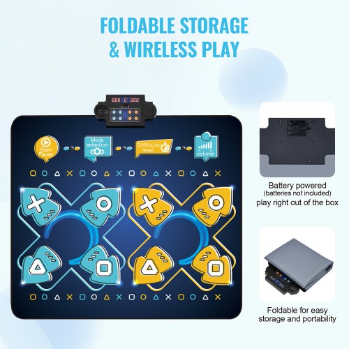 VEVOR Dance Mat for Kids Dance Pad Toys Two Player Gift for 3+ Year Old GirlsDance Your WaySingle & Two Player ModesEasy Storage & PortabilityDesigned with You in MindIdeal Gift for KidsEntertainment Meets Early EducationModes: 8 (Single Player)/3 (Two Player),Number of Built-In Songs: 8,Number of Dance Spots: 8,Power Source: 3 x AA Batteries (Not Included),Number of Function Keys: 5,Item Model Number: YQ3324,Product Weight: 1.52 lbs/0.69 kg,Style: Stand-Alone, Two Player,Material: ABS Music Box + Vinyl/PE Composite OPP Surface + PEVA Bottom,Product Size (Including Control Box): 40.16" x 39.37" x 1.77"/1020 x 1000 x 45 mm