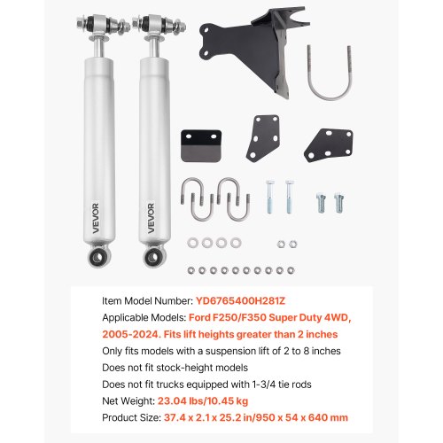 VEVOR Dual Steering Stabilizer for 2005-2024 Ford F-250/F-350 Super Duty 4WD<br/>Precision Fitment<br/>Excellent Function<br/>Strong and Durable<br/>Optimized for Rough Terrain<br/>Precisely Fits the Factory Structure<br/>Easy to Install<br/>Item Model Number: YD6765400H281Z,Net Weight: 23.04 lbs/10.45 kg,Product Size: 37.4 x 2.1 x 25.2 in/950 x 54 x 640 mm