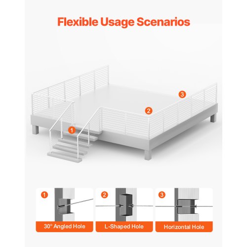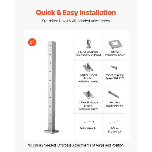 VEVOR 1-Pack Cable Railing Post, 36x2x2 In Horizontal-Hole Deck Railing Post with Pre-Drilled Holes, Stainless Steel Cable Rail Post with Horizontal and Curved Bracket, Silver, 1JZLGZXYS91466KZK001V0Horizontal Hole Railing Post4 Thoughtful HighlightsEasy to InstallFlat and Curved SupportsMulti-Scene ProtectionBuilding Code-Compliant SpacingNumber of Holes: 10,Color: Silver,Item Model Number: HR-012,Quantity: 1,Railing Post Spacing: Suitable for up to 4ft,Net Weight(include Accessories): 5.51 lbs/2.5kg (±3%),Main Material: SUS304 Stainless Steel