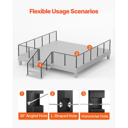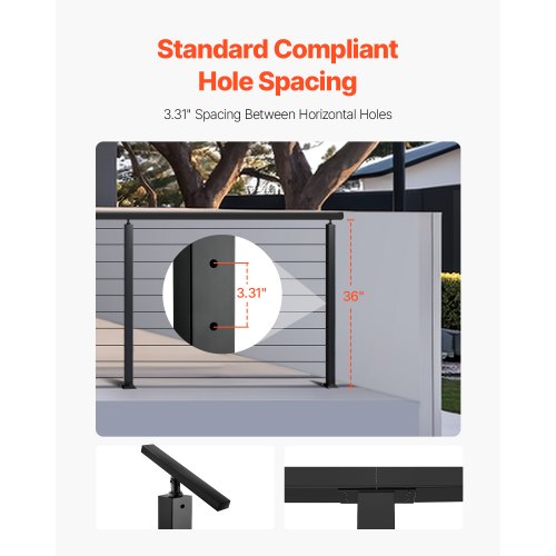 VEVOR Cable Railing Post, 36x1x2 Inch Level Deck Stair Posts, 1-Pack Stainless Steel Cable Handrail Post, Pre-Drilled Pickets with Mounting Bracket Stair Railing Kit, Black, 1JZLGZXHS914LZA6X001V0Horizontal Hole Railing Post4 Thoughtful HighlightsEasy to InstallFlat and Curved SupportsMulti-Scene ProtectionBuilding Code-Compliant SpacingThickness: 0.06"/1.5 mm,Connect Methods: Concrete/Wood,Item Size: 36 x 0.98 x 1.97"/91.4 x 2.5 x 5 cm,Base Size: 4.56 x 2.99 x 0.61"/116 x 76 x15.5 mm,Holes Distance: 3.15"/80 mm,Color: Black,Item Model Number: VV-91.4x2.5x5-LGZYK,Material: Stainless Steel+Powder Coated,Hole Diameter: 3.07"/7.8 cm,Item Weight: 1.85 kg/4 lbs
