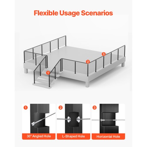 VEVOR Cable Railing Post, 42x1x2 Inch Corner Railing Post, with L-Shaped Pre-Drilled Holes, Stainless Steel Cable Rail Post with Horizontal and Curved Bracket, 1-Pack, Black, 1JZLGZXHS10607YXO001V0L-Type Hole Railing PostSturdy and DurableEasy to InstallFlat and Curved SupportsMulti-Scene Protection3" Horizontal Hole SpacingNumber of Holes: 12,Net Weight(Include Accessories): 5 lbs/2.27kg (±3%),Color: Black,Item Model Number: HR-014,Quantity: 1,Railing Post Spacing: Suitable for up to 4ft,Main Material: SUS304 Stainless Steel