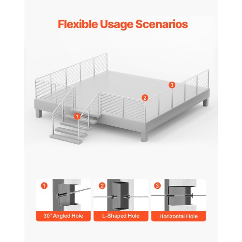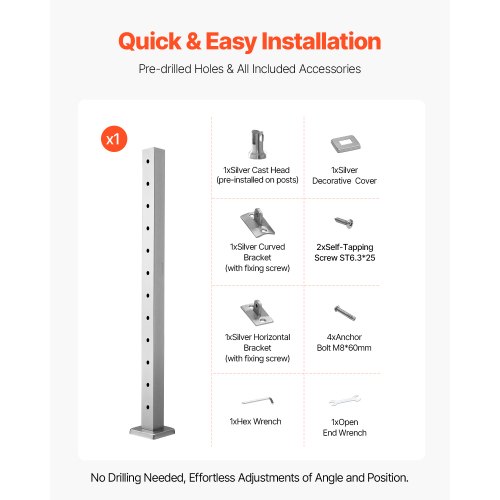 VEVOR Cable Railing Post, 42x2x2 Inch Level Deck Stair Posts, 1-Pack Stainless Steel Cable Handrail Post, Pre-Drilled Pickets with Mounting Bracket Stair Railing Kit, Silver, 1JZLGZXYS1061EF8W001V0Horizontal Hole Railing Post4 Thoughtful HighlightsEasy to InstallFlat and Curved SupportsMulti-Scene ProtectionBuilding Code-Compliant SpacingThickness: 0.06"/1.5 mm,Connect Methods: Concrete/Wood,Item Size: 42 x 1.97 x 1.97"/106.7 x 5 x 5 cm,Base Size: 5 x 3.46 x 0.61"/127 x 88 x 15.5 mm,Holes Distance: 3.15"/80 mm,Color: Silver,Item Model Number: VV-106.7x5x5-LGZYKSLIVER,Material: Stainless Steel+Powder Coated,Hole Diameter: 4.13"/105 mm,Item Weight: 2.45 kg/5.4 lbs