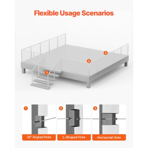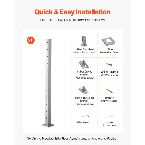 VEVOR Cable Railing Post, 42x2x2 Inch Stair Railing Post, with Pre-Drilled 30° Angled Holes, Stainless Steel Cable Rail Post with Horizontal and Curved Bracket, 1-Pack, Silver, 1JZLGZXYS1062TLWC001V030° Hole Railing Post4 Thoughtful HighlightsEasy to InstallFlat and Curved SupportsMulti-Scene ProtectionBuilding Code-Compliant SpacingNumber of Holes: 12,Color: Silver,Item Model Number: HR-005,Quantity: 1,Railing Post Spacing: Suitable for up to 4ft,Net Weight(include Accessories): 6.17 lbs/2.8kg (±3%),Main Material: SUS304 Stainless Steel