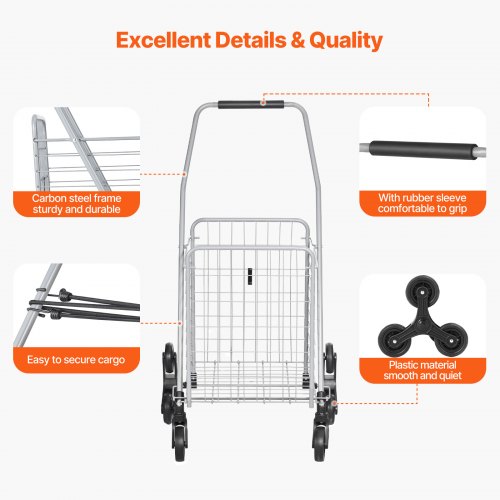 Stair Climbing Cart Foldable Shopping Cart 45L with Stair Climbing Wheels45L Large Stair Climbing CartEffortless TransportationTough and ReliableEasy to Fold and StoreOne Cart, Infinite PossibilitiesSimple to Clean and MaintainLoad Capacity on Ground: 88 lbs/40 kg,Volume: 45L,Fully Extended Size: 20.08" x 20.87" x 37.4"/510 x 530 x 950 mm,Item Model Number: 2024DB,Climbing Wheel Diameter: φ3.66"/93 mm,Product Weight: 8.6 lbs/3.9 kg,Folded Size: 44.09" x 20.87" x 9.06"/1120 x 530 x 230 mm,Material: Carbon Steel + EVA,Universal Wheel Diameter: φ3.94"/100 mm,Load Capacity When Climbing: 60 lbs/27 kg