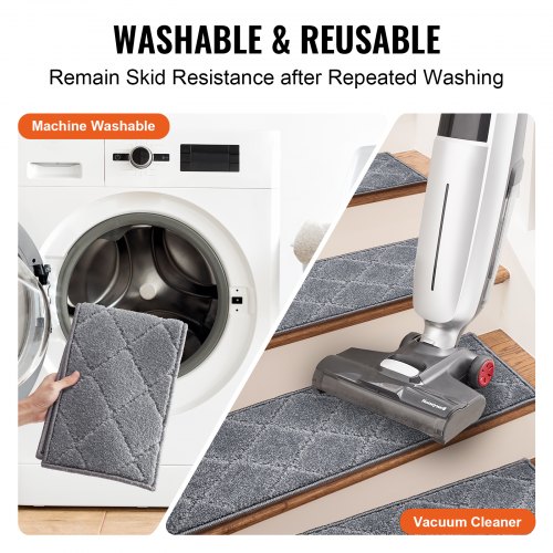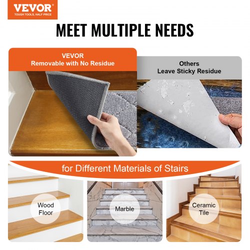 VEVOR Stair Treads, Stairs Carpet Non Slip 9" x 28", Indoor Stair Runner for Wooden Steps, Anti Slip Carpet Soft Edging Stair Rugs Mats for Kids Elders and Dogs, 15 pcs, GrayAnti-slip & No Sticky GlueEasy to Maintain2 Steps InstallCompatible with Multiple SurfacesQuiet HomeStairs ProtectionThickness: 0.4 in/11 mm,Colors: Gray,Item Model Number: GGDQ-GY,Quantity: 15 PCS,Surface Material: Polypropylene Fiber (PP),Washing: Machine Washable,Backing Material: Non-slip TPE,Edge: Velvet Wrapping (PP),Weight: 9.96 LBS/4.52 kg,Product Size: 28.2 x 9.1 in/716 x 232 mm