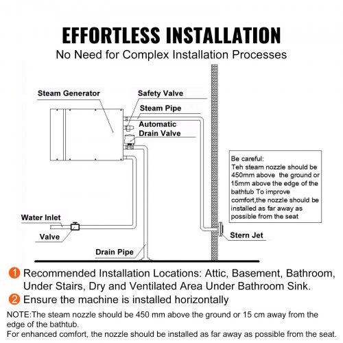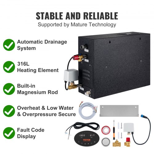 VEVOR Steam Shower Generator, 15 kW, Segmented Heating & Temperature Customization & 24h Timer Steam Bath Kit, Automatic Drainage Luxury Home Steam Shower System, Acrylic Room Max. 530 Cu. Ft.Your Personal Steam SPAEnjoy SPA In Just 5 MinutesQuick Steaming and Warming UpRich AccessoriesEffortless InstallationOperating Time: 10 min to 24 hours,Applicable Space: Acrylic Steam Room of 530 Cu.Ft.,Wire Breaker: 60A,Voltage: Two-Phase AC 230V 60Hz,Item Model Number: DO-150,Temperature Range: 25-55℃ / 77-131℉,Material: Shell: Q235B Steel, Liner:Stainless Steel,Net Weight (Include Accessories): 32.63 lbs / 14.8 kg,Product Dimensions: 21.34 x 7.48 x 19.29 in / 542 x 190 x 490 mm,Power: 15 kW (-10%, +5%)