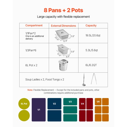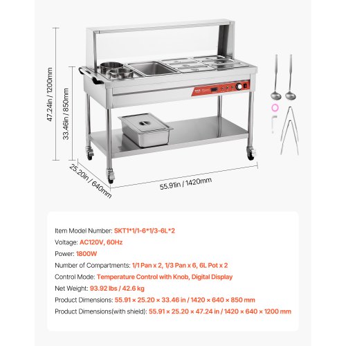 7 Pans + 2 Pots Commercial Food Warmer Steam Table with Undershelf ShieldFlexible WheelsConvenient HandleQuality Drain ValvePractical DesignWide ApplicationThoughtful DetailsNumber of Compartments: 1*1/1 Pan x 1, 1*1/3 Pan x 6, 6L Pot x 2,Control Mode: Temperature Control with Knob, Digital Display,Voltage: AC120V, 60Hz,Item Model Number: SKT1*1/1-6*1/3-6L*2,Pan Thickness: 0.6-0.7mm,Product Dimensions(L x W x H): 55.91 x 25.20 x 33.46 in / 1420 x 640 x 850 mm,Net Weight: 93.92 lbs / 42.6 kg,Product Dimensions(with shield): 55.91 x 25.20 x 47.24 in / 1420 x 640 x 1200 mm,Power: 1800W,Pan Material: 201 Stainless Steel