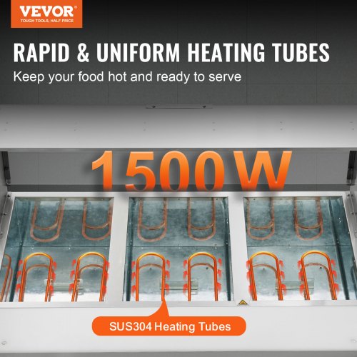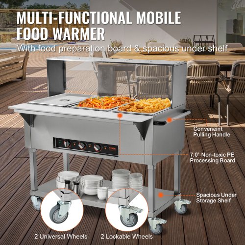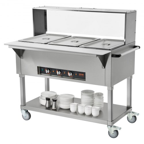 VEVOR 3-Pan Commercial Food Warmer, 3 x 20.6QT Electric Steam Table, 1500W Professional Buffet Catering Food Warmer with Acrylic Sneeze Guard, Food Grade Stainless Steel Server for Party RestaurantLarge-Capacity PansIndependent Heating ControlAcrylic Sneeze GuardMaximize Your SpaceConvenient CateringEasy MovementProduct Dimensions (with handle and guard): 45.3 x 29.5 x 45.7 in / 1150 x 750 x 1160 mm,Main Materials: SUS201, SUS304, Galvanized Sheet, PE, Acrylic,Voltage: AC120V 60Hz,Item Model Number: MDC-3C,Product Weight: 105.8 lbs / 48 kg,Pan Depth: 5.9 in / 150 mm,Power: 1500 W,Pan Material: SUS304