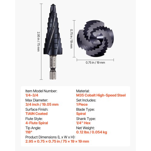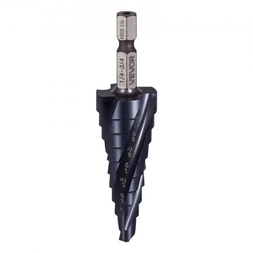 VEVOR Step Drill Bit 1/4 to 3/4 inch with 1/4 inch Hex Shank High Speed Steel<br/>9 Hole Sizes<br/>Built for Durability<br/>Efficient Drilling<br/>Precision Starts<br/>Multi-Material Capability<br/>Universal Shank<br/>Blade Type: Spiral,Tip Angle: 118°,Item Model Number: 1/4–3/4,Material: M35 Cobalt High-Speed Steel,Set Includes: 1 Piece,Surface Finish: TiAlN Coated,Product Dimensions (L x W x H): 2.95 x 0.75 x 0.75 in / 75 x 19 x 19 mm,Max Diameter: 3/4 inch / 19.05 mm,Shank Type: 1/4" Hex,Flute Style: 4-Flute Spiral,Net Weight: 0.12 lbs / 0.054 kg