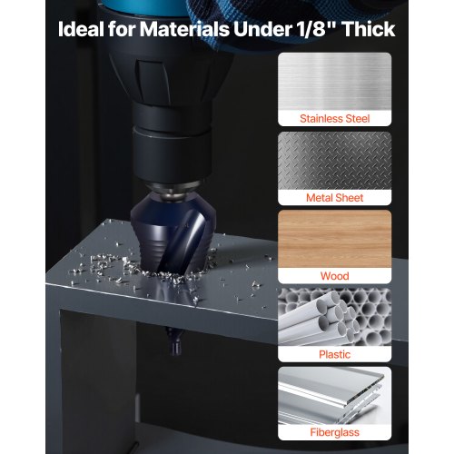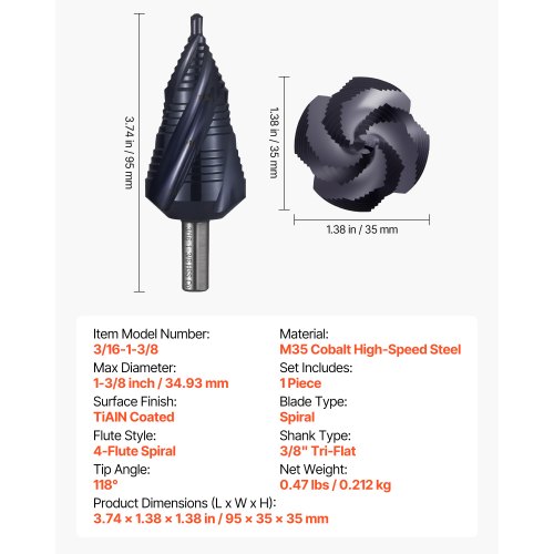 VEVOR Step Drill Bit 3/16 to 1-3/8 in High Speed Steel 3/8 in Triangular Shank<br/>19 Hole Sizes<br/>Built for Durability<br/>Efficient Drilling<br/>Precision Starts<br/>Multi-Material Capability<br/>Universal Shank<br/>Blade Type: Spiral,Tip Angle: 118°,Item Model Number: 3/16–1-3/8,Material: M35 Cobalt High-Speed Steel,Set Includes: 1 Piece,Surface Finish: TiAlN Coated,Product Dimensions (L x W x H): 3.74 x 1.38 x 1.38 in / 95 x 35 x 35 mm,Max Diameter: 1-3/8 inch / 34.93 mm,Shank Type: 3/8" Tri-Flat,Flute Style: 4-Flute Spiral,Net Weight: 0.47 lbs / 0.212 kg