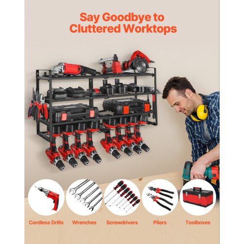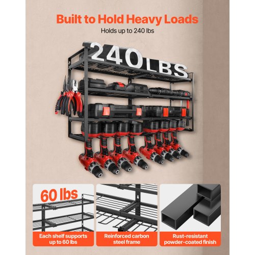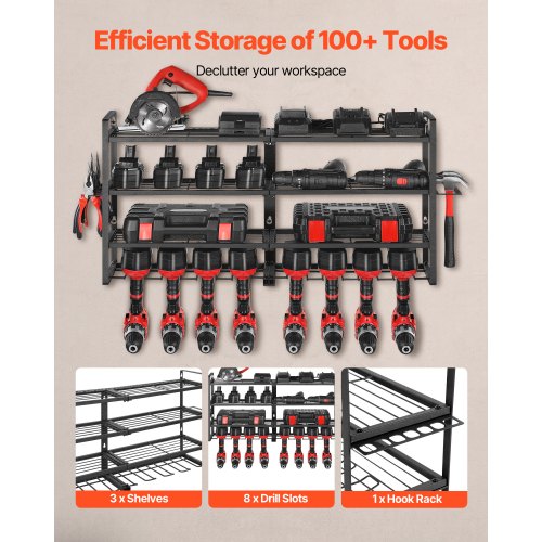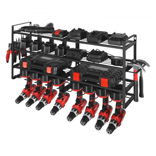 VEVOR Power Tool Organizer Wall Mount 4-Layer Tool Storage Rack 8 Drill Holders<br/>Efficient Storage<br/>Easy Access<br/>Durable & Reliable<br/>Quick Installation<br/>Versatile Use<br/>Space-saving Design<br/>Number of Tiers: 4 Tiers,Color: Black,Item Model Number: WTR06,Item Dimensions: 36.56 x 7.87 x 16.54 in / 928.5 x 200 x 420 mm,Slot Depth: 6.5 inch / 167 mm,Net Weight: 12.43 lbs / 5.64 kg,Number of Slots: 8 Slots