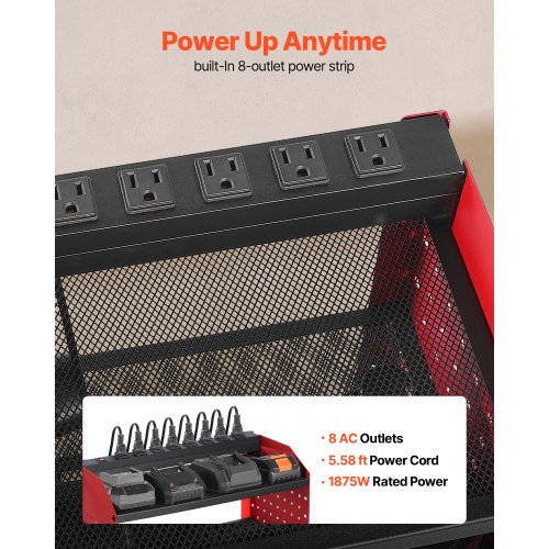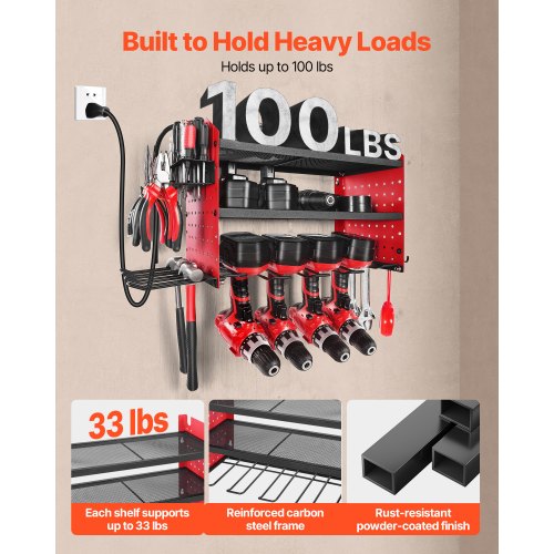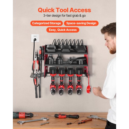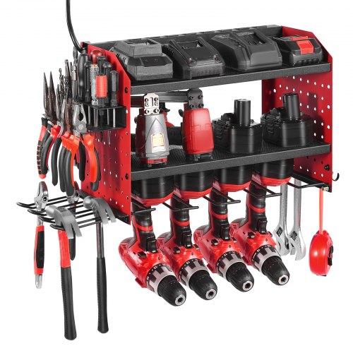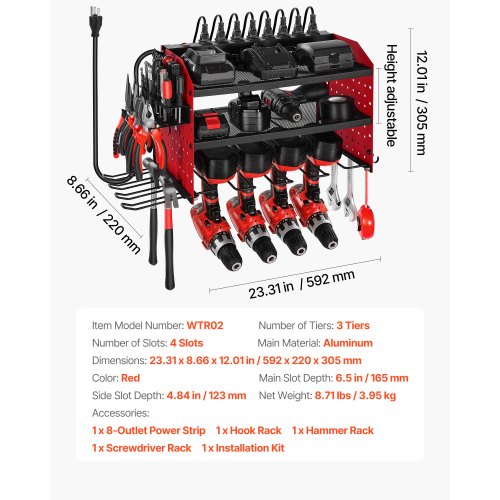 VEVOR Power Tool Organizer with Charging Station 3-Layer Drill Storage Rack<br/>Efficient Storage<br/>Easy Access<br/>Durable & Reliable<br/>Quick Installation<br/>Versatile Use<br/>Space-saving Design<br/>Number of Tiers: 3 Tiers,Main Slot Depth: 6.5 in / 165 mm,Color: Red,Item Model Number: WTR02,Dimensions: 23.31 x 8.66 x 12.01 in / 592 x 220 x 305 mm,Side Slot Depth: 4.84 in / 123 mm,Net Weight: 8.71 lbs / 3.95 kg,Number of Slots: 4 Slots