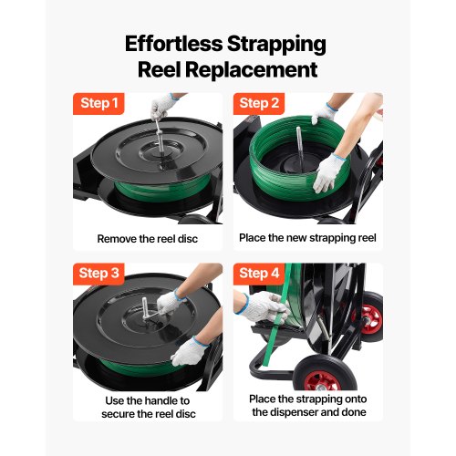 VEVOR Banding Strapping Cart for PET/ PP/Polyester Straps with 8 or 16 in Core<br/>High-strength Carbon Steel Frame<br/>Low-noise Rubber Wheels<br/>Automatic Brake System<br/>Quick Dispensing<br/>Large Tool Box<br/>Multi-scene Use<br/>Outer Diameter: Ø24.4 in / Ø62 cm,Toolbox Dimensions: 14.6 x 7.9 x 3.9 in / 37 x 20 x 10 cm,Item Model Number: DPC400,Product Weight: 32.4 lbs / 14.7 kg,Max Load Capacity: 110.2 lbs / 50 kg,Core Diameter: 16 in / 406 mm (compatible with 8 in / 203 mm),Material: Q235 Carbon Steel,Product Dimensions: 16.1 x 26.4 x 39.4 in / 410 x 670 x 1000 mm,Strap Type Compatibility: PET / PP / Polyester