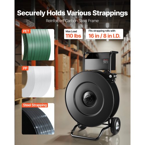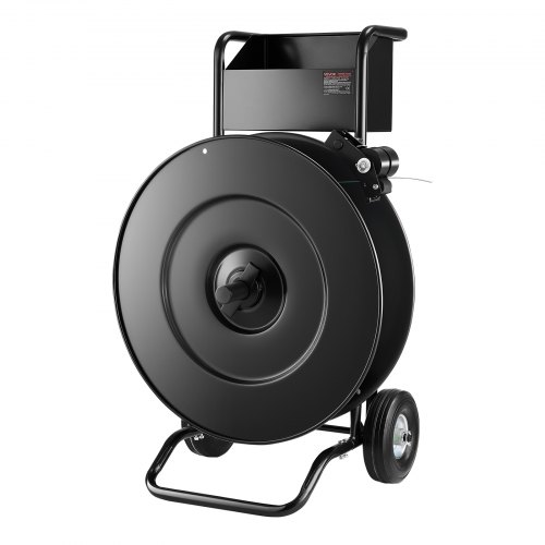 VEVOR Banding Strapping Cart for PET/ PP/Steel Straps with 8 or 16 in Core<br/>High-strength Carbon Steel Frame<br/>Low-noise Rubber Wheels<br/>Upgraded Non-slip Drum Brake System<br/>Tangle-Free Design<br/>Large Tool Box<br/>Multi-scene Use<br/>Outer Diameter: Ø24.4 in / Ø62 cm,Toolbox Dimensions: 12.8 x 6.9 x 8.3 in / 32.5 x 17.5 x 21 cm,Item Model Number: CL-FT406,Product Weight: 55.9 lbs / 25.35 kg,Max Load Capacity: 110.2 lbs / 50 kg,Core Diameter: 16 in / 406 mm (compatible with 8 in / 203 mm),Material: Q235 Carbon Steel,Product Dimensions: 20.5 x 24.8 x 39.0 in / 520 x 630 x 990 mm,Strap Type Compatibility: PET / PP / Steel-plastic Strap