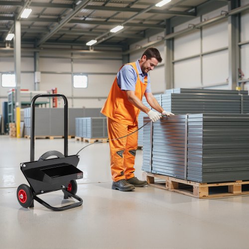 VEVOR Banding Strapping Cart for Steel Straps 23.6 in Core Strapping Dispenser<br/>High-strength Carbon Steel Frame<br/>Low-noise Rubber Wheels<br/>Smooth Dispensing Mechanism<br/>Quick Dispensing<br/>Large Tool Box<br/>Multi-scene Use<br/>Suitable Coil Outer Diameter: 23.6 in / 600 mm,Toolbox Dimensions: 14.6 x 7.9 x 3.9 in / 37 x 20 x 10 cm,Item Model Number: GD500,Product Weight: 28.4 lbs / 12.9 kg,Max Load Capacity: 110.2 lbs / 50 kg,Material: Q235 Carbon Steel,Product Dimensions: 17.3 x 26.4 x 39.4 in / 440 x 670 x 1000 mm,Strap Type Compatibility: Steel Strapping Coils